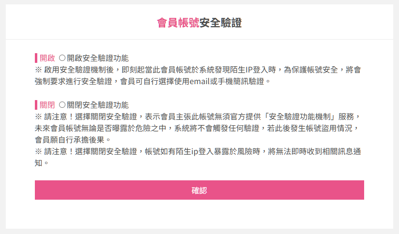 A. 選擇「開啟安全驗證功能」: 未來當此會員帳號於系統發現陌生IP登入時,為保護帳號安全,將會強制要求進行安全驗證,會員可自行選擇使用email或手機簡訊驗證。(請見下方安全驗證介紹)